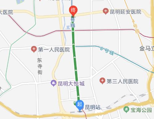 時(shí)間短上車(chē)站昆明火車(chē)站(A口進(jìn))起昆明站 步行 80米 至 昆明火車(chē)站(約2分鐘) 地鐵1號(hào)線(環(huán)城南路方向) 昆明火車(chē)站 上車(chē)(A口進(jìn)) 環(huán)城南路 下車(chē) 上車(chē)站 首:06:42 末:23:27 約5分鐘/趟1站 環(huán)城南路 繼續(xù)乘坐,請(qǐng)勿下車(chē) 地鐵2號(hào)線(北部汽車(chē)站方向) 環(huán)城南路 上車(chē) 交三橋 下車(chē)(C口出) 上車(chē)站 首:06:45 末:23:30 約5分鐘/趟3站 步行 160米 至 終點(diǎn)(約3分鐘) 終750眼科